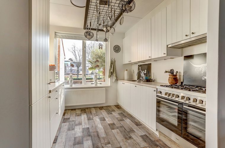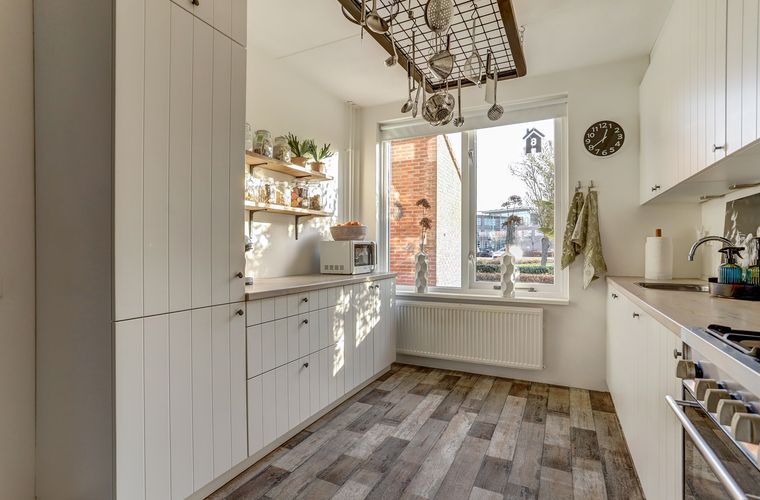 Begane grond: entree; hal met meterkast, toilet met fonteintje, trapkast en toegang tot de woonkamer; de lichte woonkamer is voorzien van een open keuken en een loopdeur naar de achtertuin; keuken is voorzien van 6-pits gasfornuis met dubbele oven, afzuigkap, spoelbak, vaatwasser en ingebouwde koelkast.