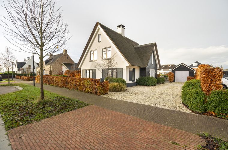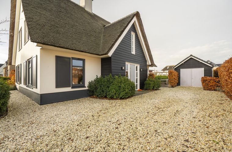 Oprit met ruimte voor het parkeren van meerdere auto's. Hier is een laadpaal. Houten beklede garage; volledig geïsoleerd en opgebouwd uit beton met dubbele deuren aan opritzijde, zij-ingang, elektra en vide (met voorbereiding voor wateraansluiting). Tuin rondom met beregeningssysteem, in light verlichting met diverse terrassen. Aan de achterzijde staat een overkapping met lichtstraat en spotverlichting. Ook aan de zijkant is een deel van het terras overdekt. Aan het water is een ruime vlonder aan waar je eenvoudig een mooie zithoek kunt plaatsen.