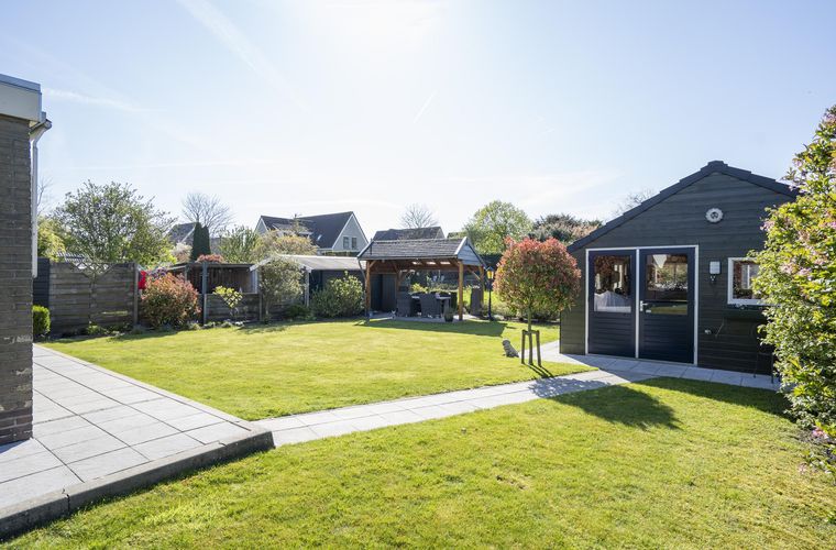 - Grasveld in de achtertuin met pad naar de schuur en terras