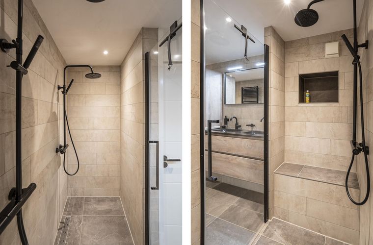 Eerste verdieping: overloop met afsluitbaar trappenhuis; in totaal drie slaapkamers; vernieuwde badkamer ('20) met ruime en dubbele inloopdouche, dubbele wastafel met meubel, toilet, design radiator en vloerverwarming.