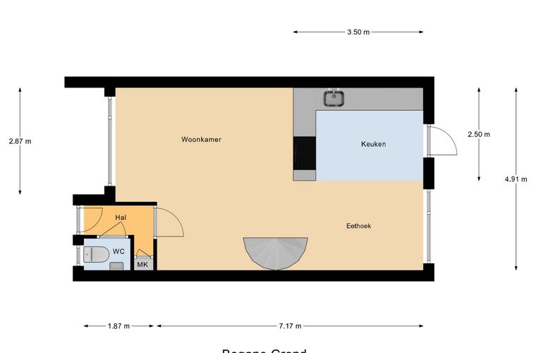 Begane grond: entree; hal met garderobe, meterkast en toilet met fonteintje; open woonkamer met grote raampartijen, spiltrap naar de eerste verdieping; open keuken voorzien van 5-pits gasfornuis, combi-oven, vaatwasser, spoelbak en koel/vriescombinatie; deur naar de achtertuin.