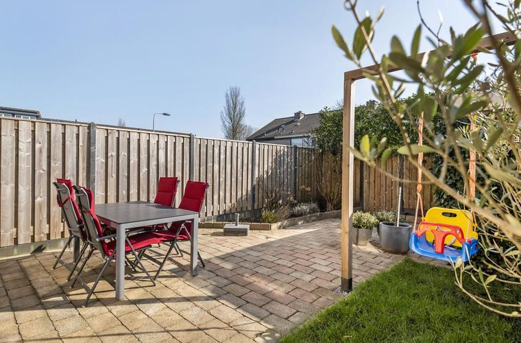 - Zonnige achtertuin met terras en bloembak met beplanting