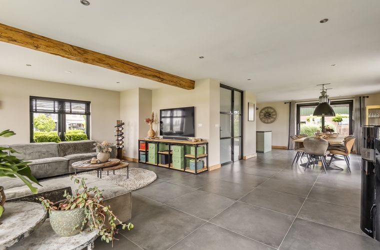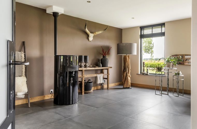 - Sfeervolle elementen zoals houten balken en een pelletkachel