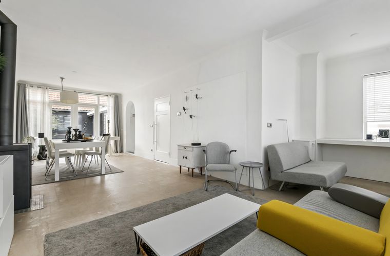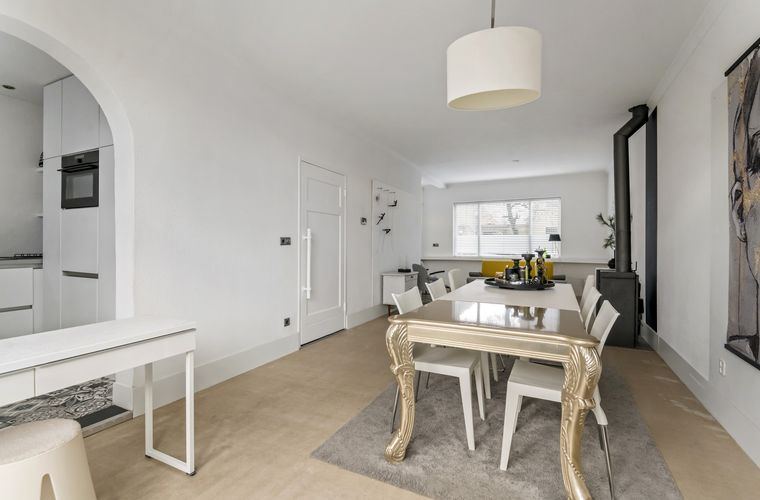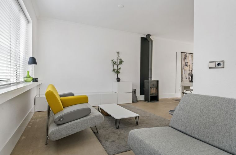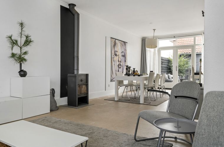 - Royale, lichte woonkamer met houtkachel en openslaande deuren