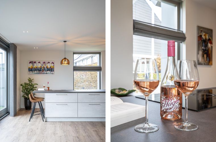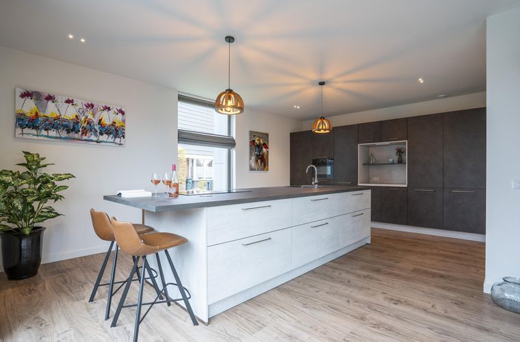 De keuken, gelegen aan de voorzijde van de woning, is zeer royaal van opzet en voorzien van alle denkbare inbouwapparatuur. Geniet van het luxe eiland met een inductiekookplaat met recirculatie afzuigsysteem, koelkast, 3-in-1 kokend water kraan, combi bak- en stoomoven plus magnetron en vaatwasser. De mooie raampartij met eveneens een schuifpui zorgt voor veel daglichttoetreding.