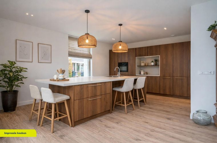 De keuken, gelegen aan de voorzijde van de woning, is zeer royaal van opzet en voorzien van alle denkbare inbouwapparatuur. Geniet van het luxe eiland met een inductiekookplaat met recirculatie afzuigsysteem, koelkast, 3-in-1 kokend water kraan, combi magnetron-stoom-bakoven en vaatwasser. De mooie raampartij met eveneens een schuifpui zorgt voor veel daglichttoetreding.