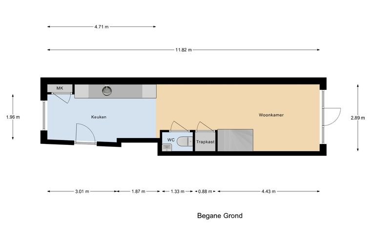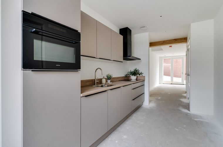 Begane grond: entree; meterkast; keuken voorzijde voorzien van inductiekookplaat, afzuigkap, combi-oven, spoelbak, vaatwasser en koelkast met vriesvakje; toilet met fonteintje; trapkast; lichte woonkamer met toegang tot de tuin; trapopgang eerste verdieping.
