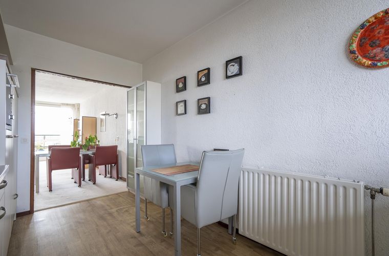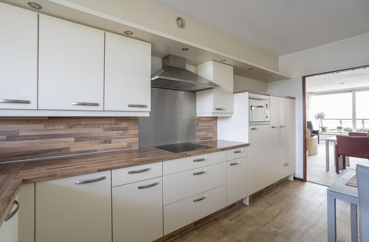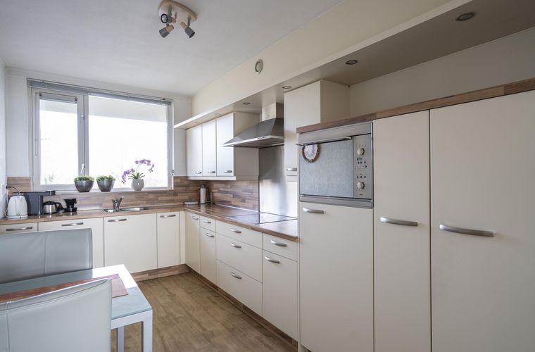 De keuken ligt aan de voorzijde van het appartement en is uitgevoerd met een inductiekookplaat met afzuigkap, een vaatwasser, een combi-oven, een koelkast, vriezer en veel werk- en opbergruimte.
