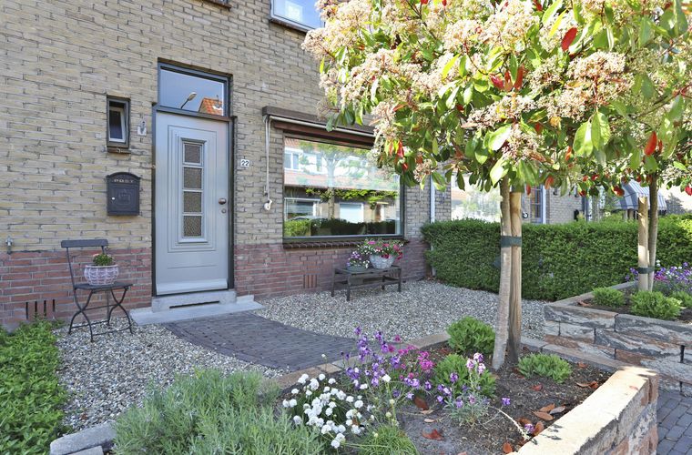 De voortuin is verzorgd aangelegd met fraaie plantenbakken en diverse beplanting. De diepe, speels ingedeelde achtertuin beschikt over een mooi grasveld, twee terrassen én borders met een gevarieerde mix van bloemen en planten. Dankzij de gunstige ligging op de middag- en avondzon is het hier heerlijk vertoeven. Je vindt altijd een plek in de zon of juist in de schaduw. Onder de ruime overkapping kun je ook ’s avonds comfortabel buiten zitten, zelfs als het wat frisser wordt. Aansluitend is er een praktische houten berging voor bijvoorbeeld tuingereedschap of fietsen. Bovendien is de tuin bereikbaar via een handige achterom.