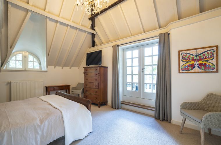 Eerste verdieping; overloop met toegang tot drie slaapkamers; master bedroom met inloop kast, airco, toegang tot balkon op sedumdak; badkamer met ligbad, douche, toilet en twee spoelbakken; tweede slaapkamer met wastafel en bergruimte; derde slaapkamer aan de dijkzijde met originele balken en berging; kantoorruimte met bergingen en inloopkast.