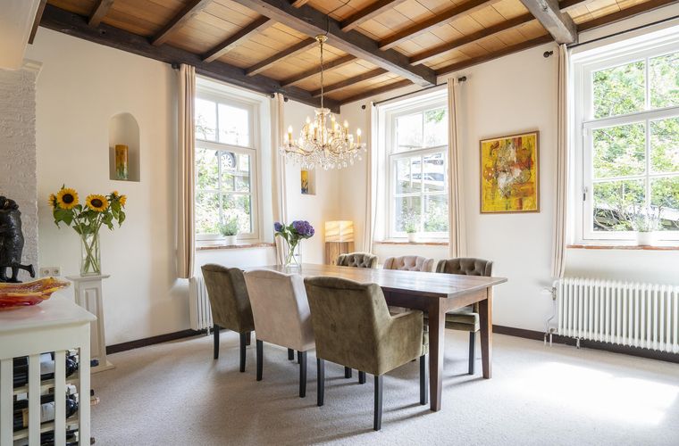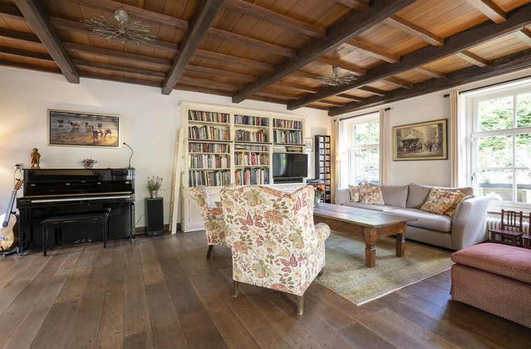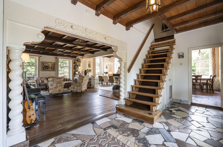 Een huis met karakter, dat voel je meteen. De oude balken, half ronde ramen en speelse niveauverschillen geven elke ruimte een eigen sfeer. De woonkamer is warm en uitnodigend, met een schouw als middelpunt en uitzicht op het groen. Hier nestel je je ’s winters met een goed glas bij de haard, terwijl je in de zomer de...