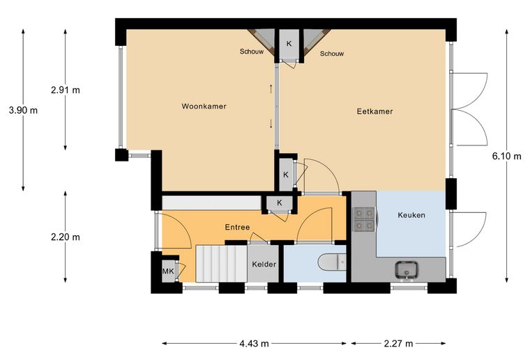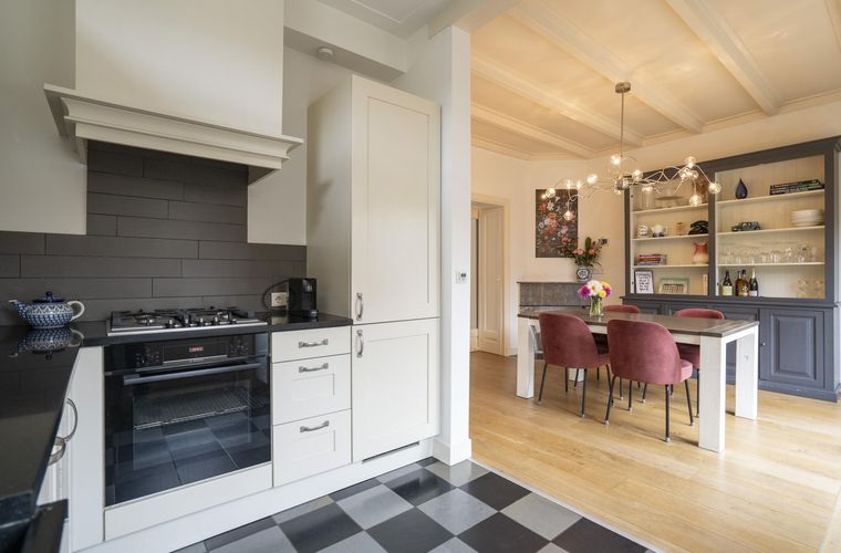 Begane grond: entree met hal, toilet, trapopgang naar de eerste verdieping, trapkast/kelder, praktische opbergruimte en toegang tot de leefruimte; woonkamer met houtkachel en en-suite deuren naar de eetkamer met openslaande deuren; open keuken in hoekopstelling met o.a. een gaskookplaat, combi-oven, koelkast, vriezer, vaatwasser, spoelbak met Quooker kraan.