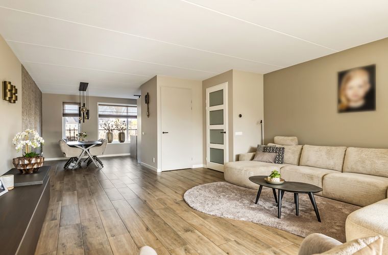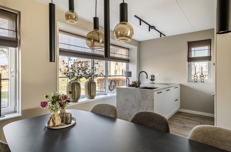De woonkamer is tuingericht en heerlijk licht dankzij de openslaande deuren naar buiten. De open keuken met schiereiland vormt een gezellig punt in huis, afgewerkt met een doorlopend Taj Mahal kwartsiet natuurstenen werkblad en voorzien van een Quooker en moderne inbouwapparatuur. Terwijl je staat te koken, kijk je via de diepe vensterbank uit op de speeltuin met houten toestellen en het groen aan de voorzijde; genieten van een vrij uitzicht, zonder directe inkijk.