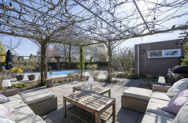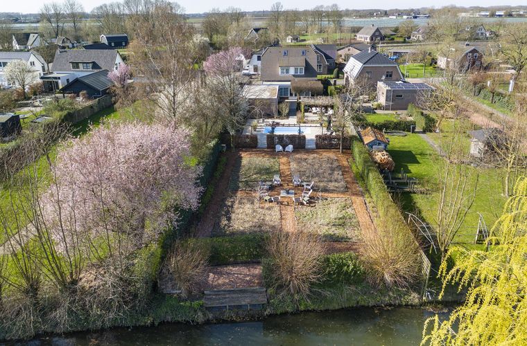 Verzorgde voortuin met leibomen en sierbeplanting; oprit met ruimte voor meerdere auto’s; pad naar de zijtuin; garage met dubbele deuren, vaste kast, elektra en cv; poolhouse met badkamer en hobbyruimte; diverse terrassen onder beuken; zwembad met zomer- en winterafdekking; fraai aangelegde tuin met bloemen, planten en fruitbomen; houten vlonder aan het water.