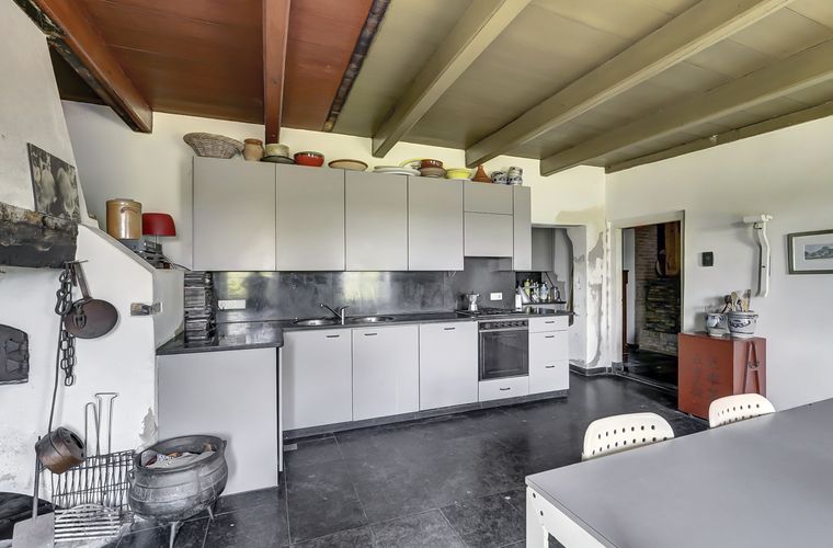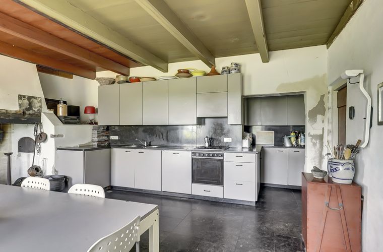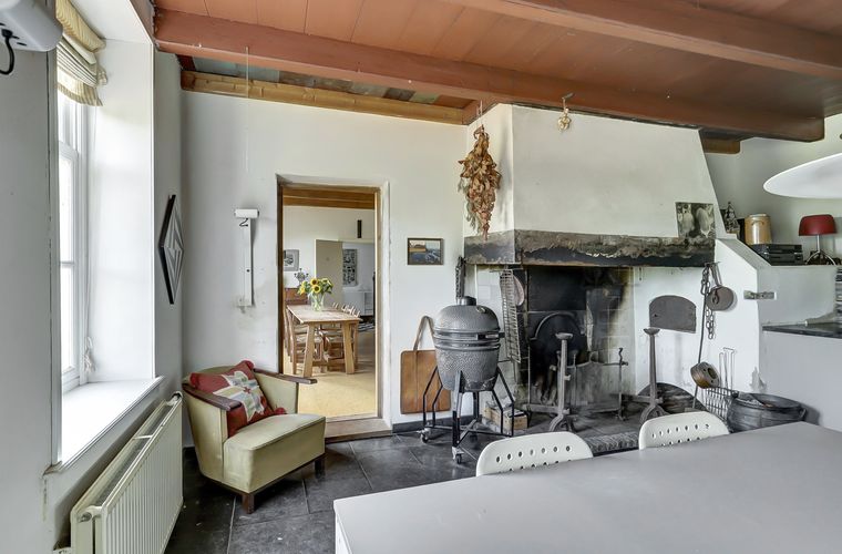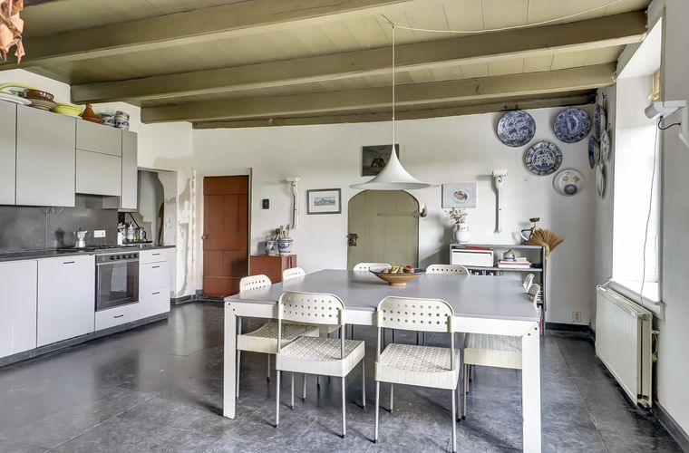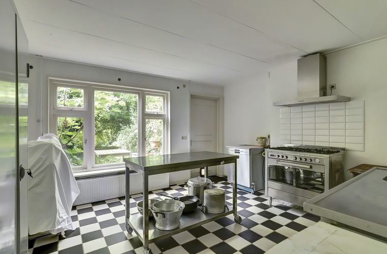 De bijkeuken is nog eens voorzien van een brede oven met daarop een 6-pits gasfornuis. Een vaatwasser en een koelkast; deze bijkeuken leid ook naar de kelder, maar deze kelder wordt gehuurd door de buren. Via de bijkeuken kom je ook in de achtertuin. Boven de bijkeuken zit nog een ruime vliering.