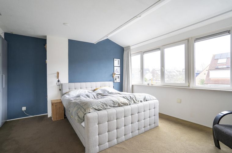 Eerste verdieping: overloop: slaapkamer aan voorzijde met kastenwand, masterbedroom aan achterzijde met dakkapel en kastenwand; badkamer ingericht met een ligbad, toilet en wastafelmeubel.