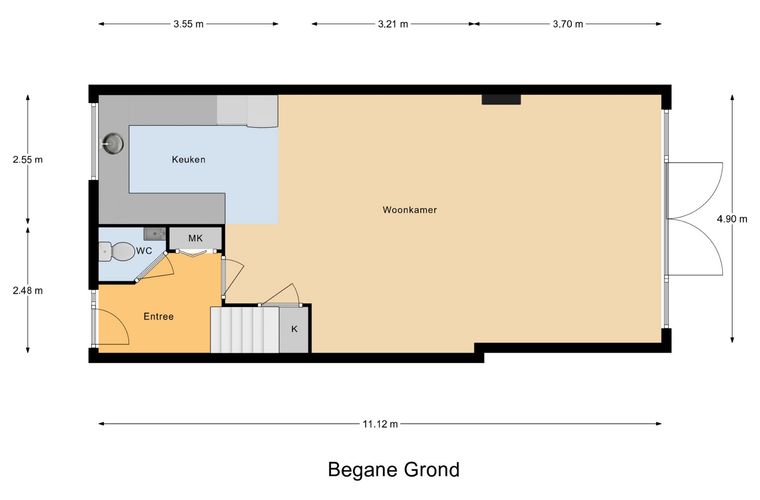 Begane grond: entree; hal, toilet met fonteintje, garderobe, meterkast en trapopgang; royale woonkamer met openslaande deuren, een allesbrander en trapkast; keuken aan de voorzijde voorzien van spoelbak, vaatwasser, koelkast, vriezer, oven, combioven, afzuigkap en inductiekookplaat met wokbrander.
