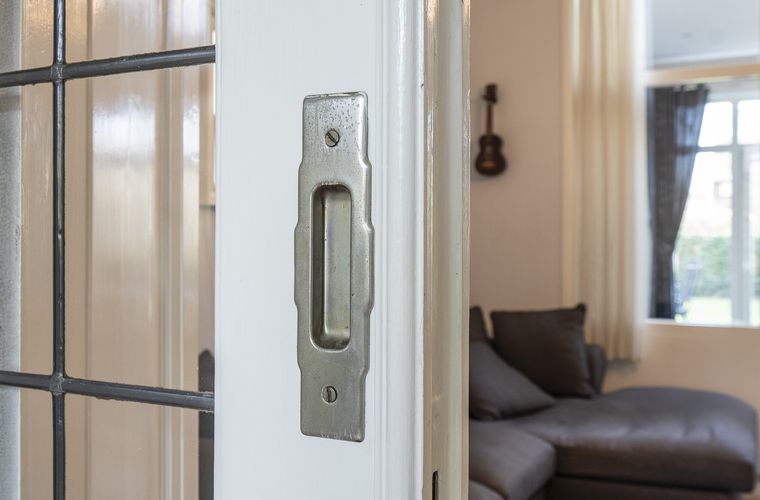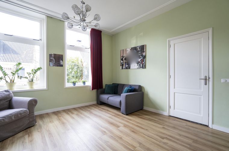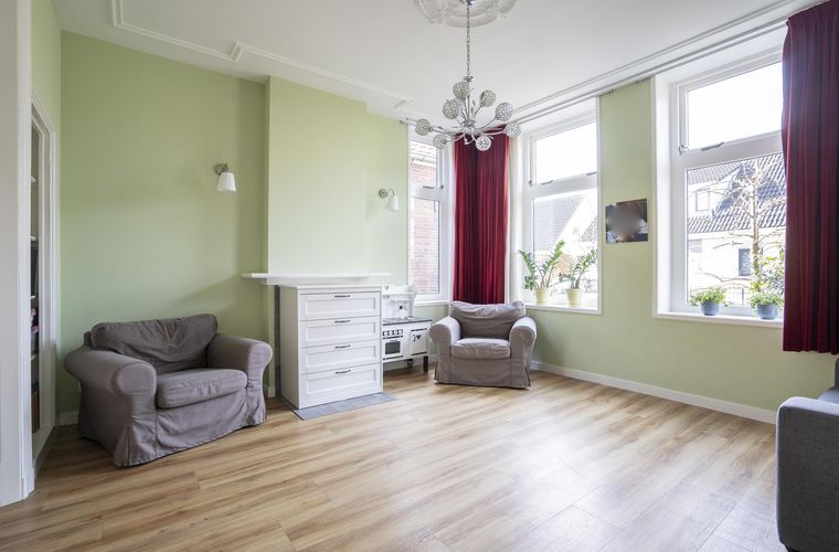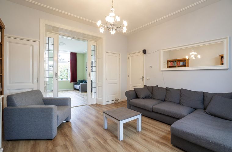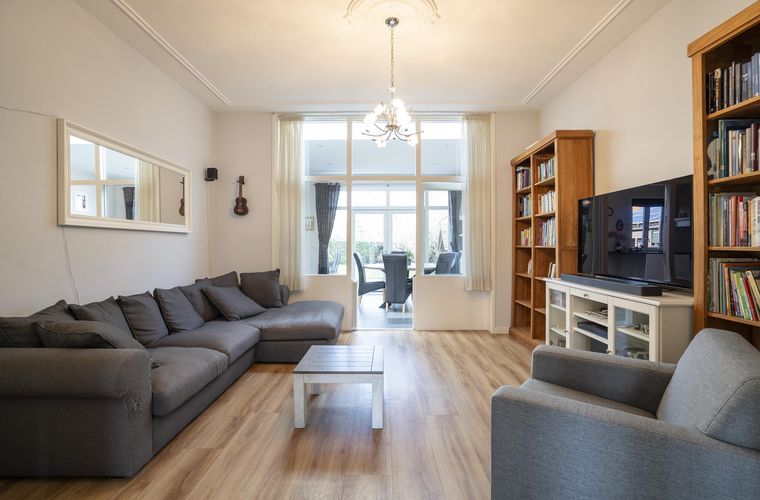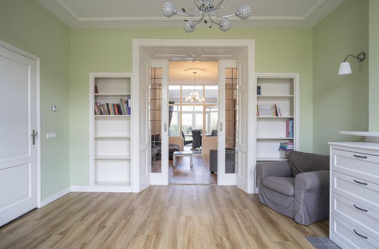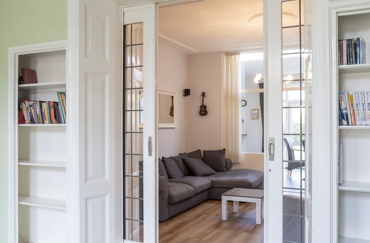 De woonkamer met ensuite deuren biedt een fijne balans tussen openheid en geborgenheid. Hier geniet je van de karaktervolle details en het prettige licht dat door de hoge ramen naar binnen valt. Daarnaast is er op de begane grond een kantoorruimte aanwezig, ideaal voor thuiswerken of als speelkamer.