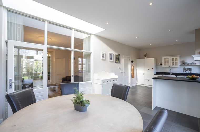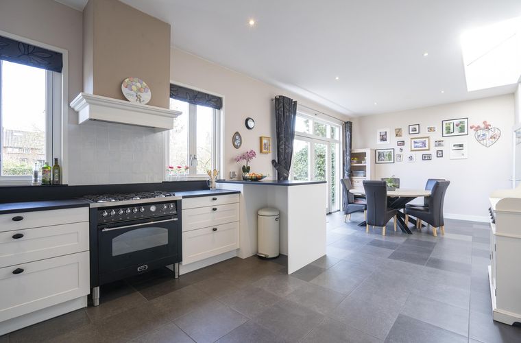 Met een woonoppervlakte van circa 185 m² is ruimte hier absoluut geen probleem. De verschillende leefruimtes lopen prettig in elkaar over en geven het huis een warme, uitnodigende sfeer. Aan de achterzijde bevindt zich de royale woonkeuken, een heerlijke plek waar het dagelijks leven zich vanzelf afspeelt. Dankzij de lichtstraat valt het daglicht hier rijkelijk naar binnen en via de openslaande deuren loop je zo de tuin in. Terwijl er gekookt wordt op het 6-pits gasfornuis, is er aan de eettafel alle ruimte voor lange diners, huiswerk of een goed gesprek.