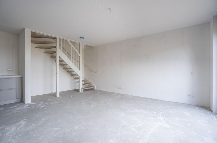 Begane grond: entree en berging voorzijde, hal met meterkast, toilet met fonteintje en toegang tot de woonkamer; lichte woonkamer met grote schuifpui aan de voorzijde; open keuken voorzien van inductiekookplaat (Bora), vaatwasser, koelkast, vriezer, combi-oven en Quooker; open trap naar eerste verdieping.