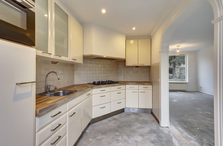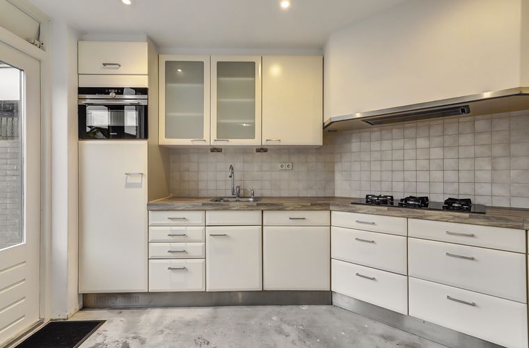 Binnen stap je een lichte woonkamer in, met een grote raampartij aan de voorzijde en een doorloop naar de halfopen keuken. De keuken heeft een praktische opstelling, waardoor je tijdens het koken in contact blijft met het gezin of je gasten. Binnen in de woning zijn de wanden weer fris geschilderd. De achtertuin? Die ligt lekker op het zuiden, dus zonliefhebbers zitten hier gebakken. Achterin de tuin staat een houten berging, ideaal voor fietsen en tuinspullen, en via de achterom ben je zo weer op pad.
