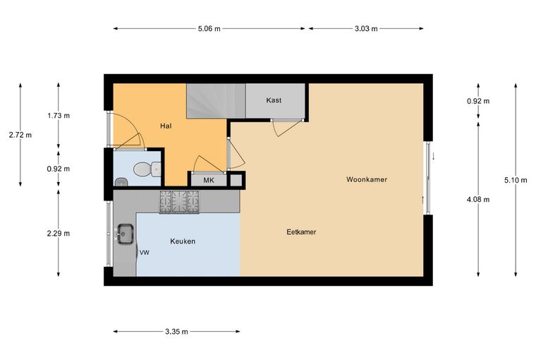 Begane grond: Entree; hal met meterkast, toilet voorzien van fonteintje, garderobe en toegang tot woonkamer; Woonkamer met schuifpui en airco en open keuken; Keuken voorzien van 5-pits gaskookplaat, combi-oven, afzuigkap, vaatwasser, spoelbak, koelkast en vriezer.