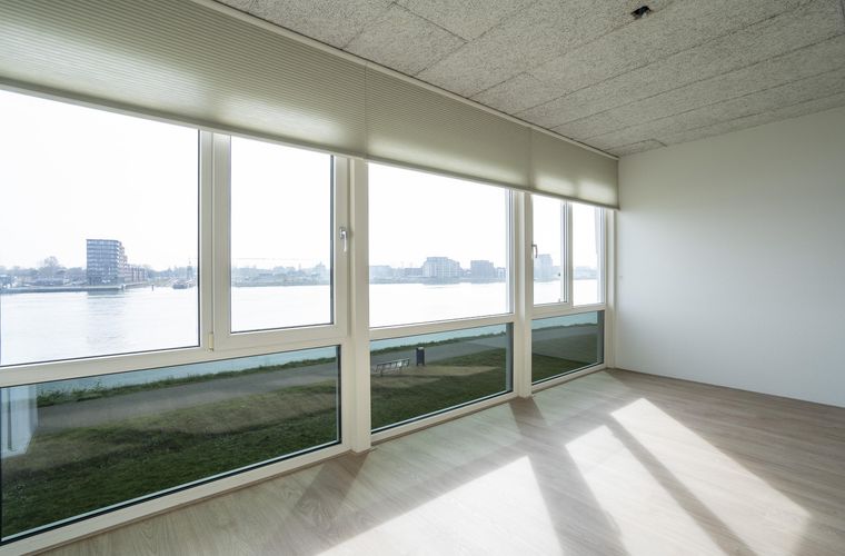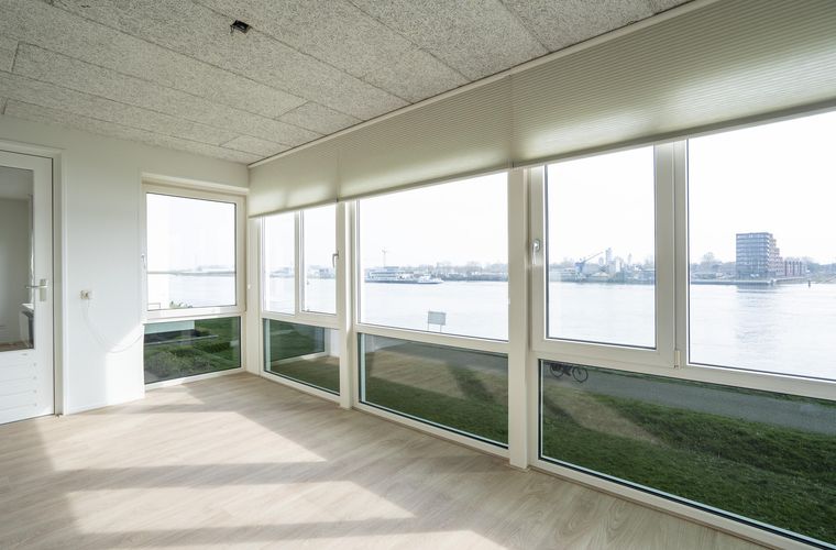 De woonkamer, gelegen aan de rivierzijde, biedt een fenomenaal uitzicht over het water. Of het nu gaat om voorbijvarende schepen, de prachtige luchten, de rust van de natuur of het zicht in de verte op het historische Dordrecht, hier geniet je dagelijks van een unieke sfeer en een ongeëvenaard uitzicht.