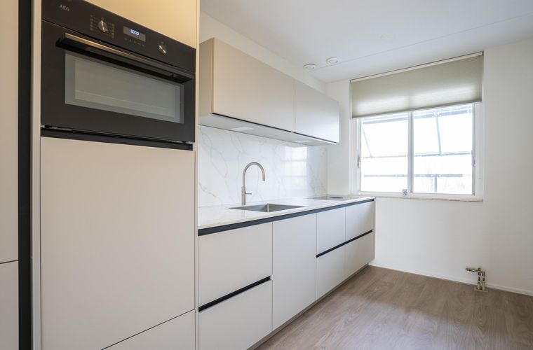 De volledig nieuwe keuken, gelegen aan de voorzijde van het appartement, biedt o.a. een BORA inductiekookplaat met interne afzuiging, een Quooker kokendwaterkraan en een combi-oven (AEG).
