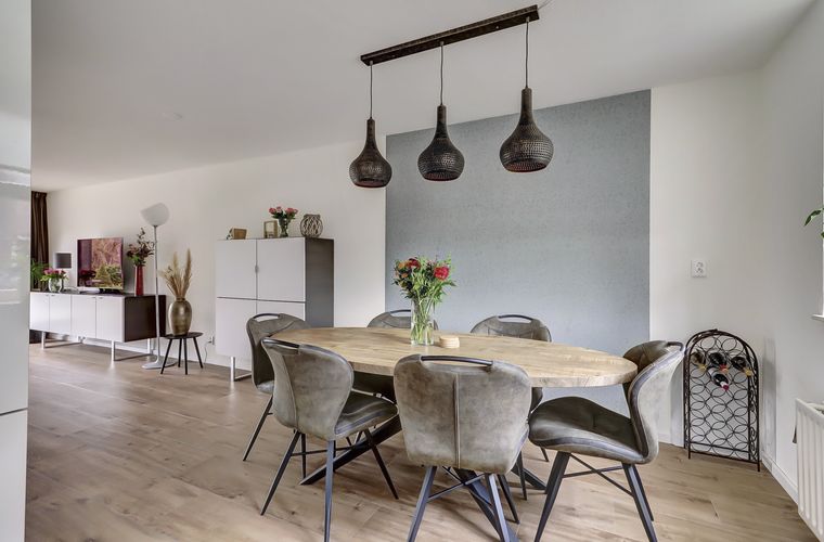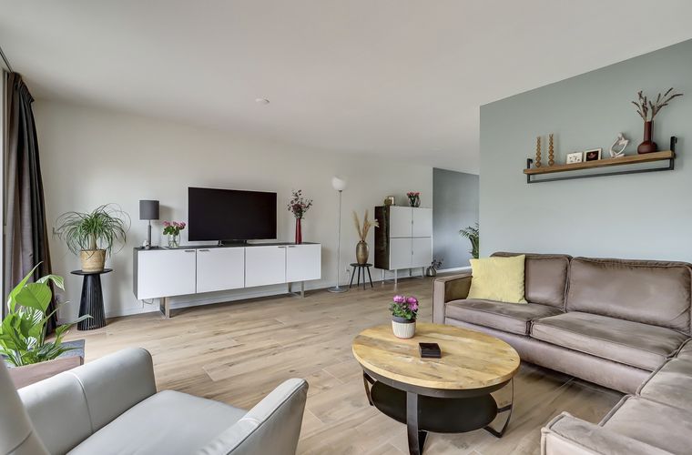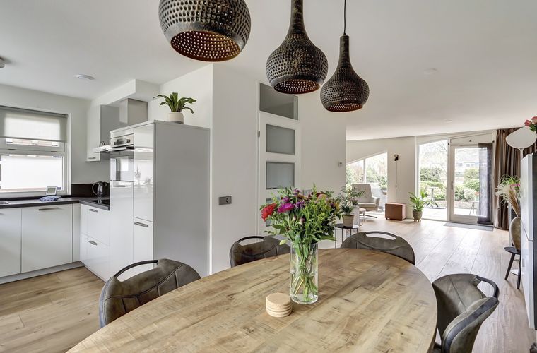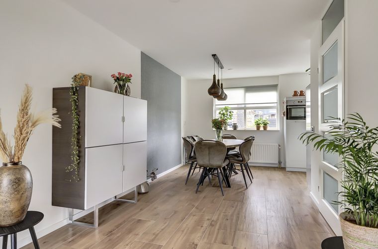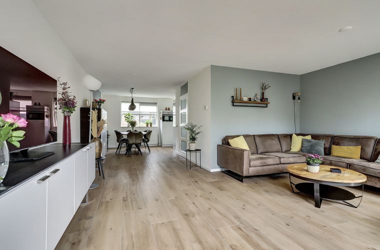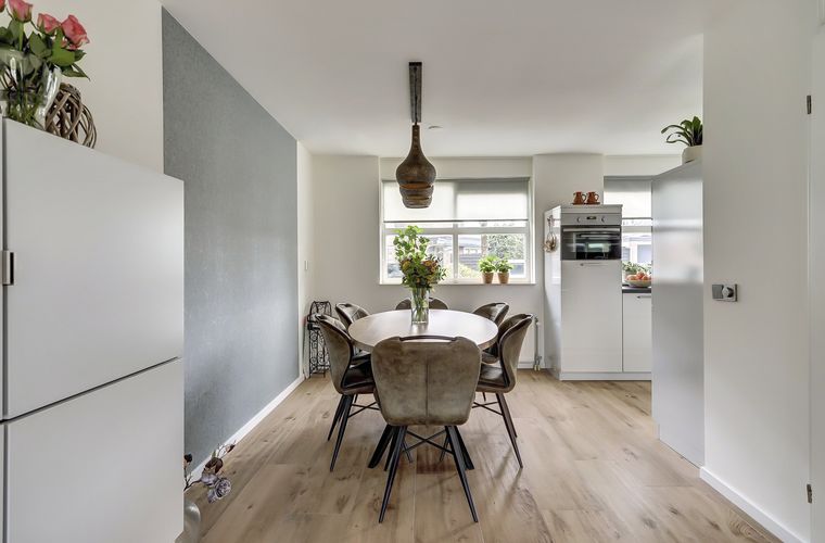 De woonkamer is royaal en speels van opzet, met de open keuken als gezellig middelpunt. Dankzij de grote ramen kijk je mooi weg richting de woonwijk. De keuken is compleet uitgevoerd en praktisch ingedeeld, ideaal voor wie van koken én samenzijn houdt.