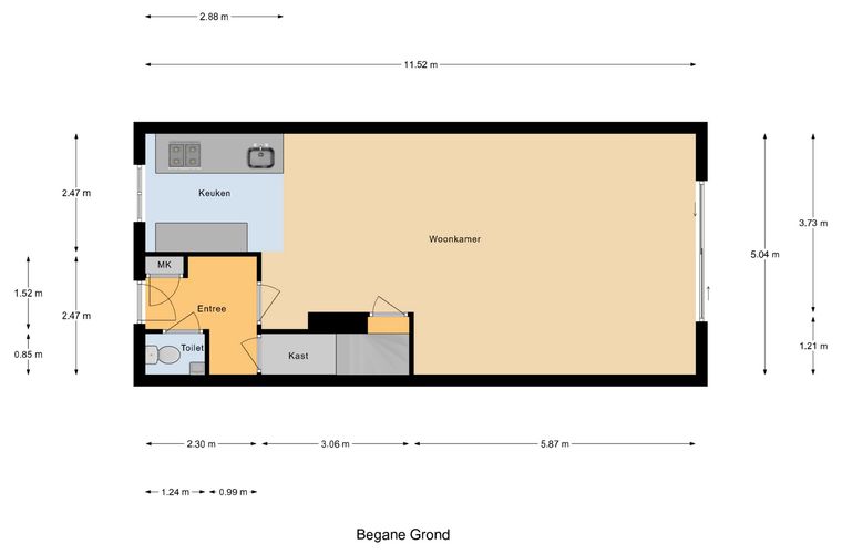 Begane grond: entree; hal met meterkast, toilet met fonteintje en trapkast; toegang tot de woonkamer; keuken aan de voorzijde in rechte opstelling met o.a. een 4-pits inductiekookplaat, combimagnetron, vaatwasser, koelkast, vriezer, afzuigkap en spoelbak; tuingerichte woonkamer met openslaande deuren; afgesloten trapopgang naar eerste verdieping.