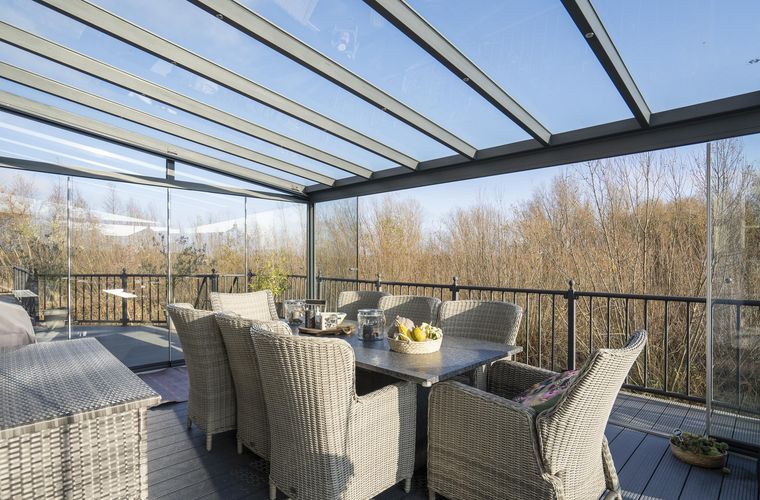- Serre met glazen schuifwanden en zonnescherm met verlichting