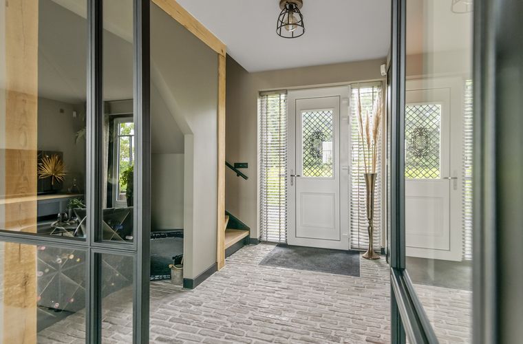 In de bijkeuken aan de linker zijde vind je de wasmachineaansluiting en vriezer. En rechts toegang tot de tuin, ook hier zijn de warmtepomp en 400-liter boiler netjes weggewerkt.
