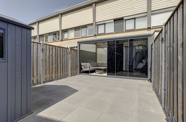 Buiten: via de achterdeur kom je in de serre en de achtertuin, deze is voorzien van een vrijstaande kunststof berging; verder is de tuin onderhoudsvrij en leidt hij naar de brandgang; via de brandgang loop je naar de parkeerplaats en de speeltuin.
