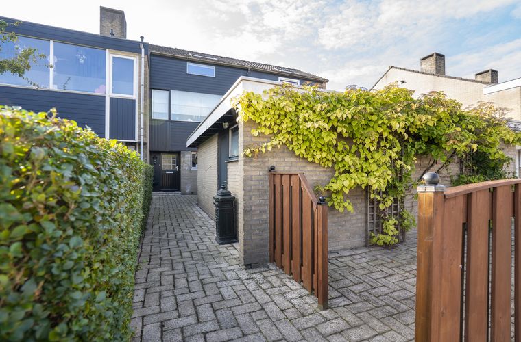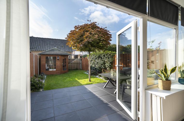 De achtertuin ligt op het zuiden en is verzorgd aangelegd met gras, plantenborders, een houten tuinhuis voorzien van elektra en achterom. De voortuin is afgescheiden met een houten schutting en biedt ruimte voor een beschut zitje. De garage ligt naast de woning en is via een roldeur én loopdeur toegankelijk. Op de oprit kun je je auto kwijt, en daarnaast is er in de straat voldoende parkeerruimte.