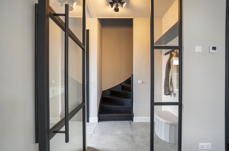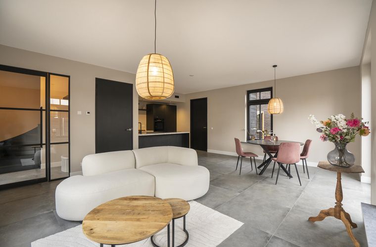 - Lichte woonkamer met stalen taatsdeur en moderne keuken