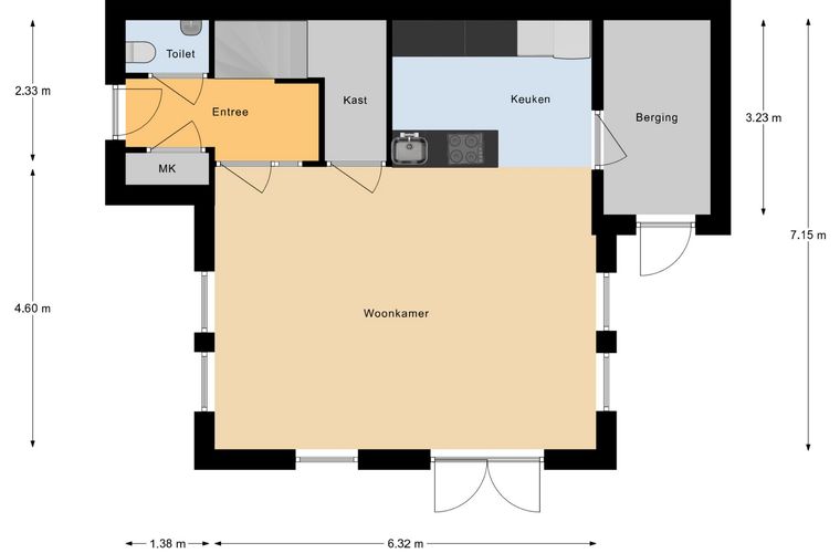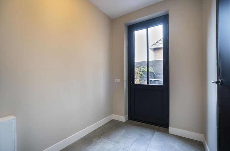 entree; hal met meterkast en toilet met fonteintje; lichte woonkamer met openslaande deuren naar de tuin, ruime berging en open keuken; vanuit de woonkamer toegang tot de bijkeuken waar de WTW-installatie en warmtepomp zich bevindt, ook treft u hier een tweede toegang tot de achtertuin; de keuken is voorzien van 4 pits inductiekookplaat met geïntegreerde afzuigsysteem, spoelbak, vaatwasser, combi-oven, koelkast en vriezer;