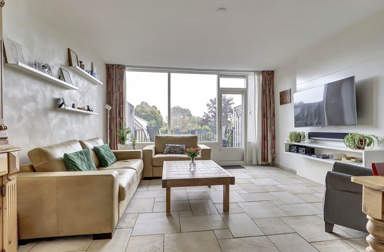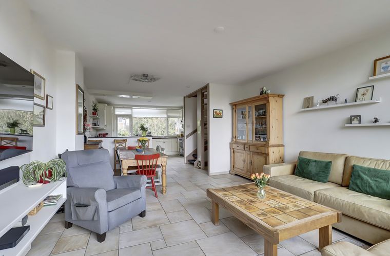 Eerste verdieping: woonkamer met toegang tot het balkon; ruime open keuken voorzien van een dubbele spoelbak, afzuigkap, vaatwasser, koelkast en vriezer; vanuit de keuken toegang tot een tweede balkon aan de voorzijde;