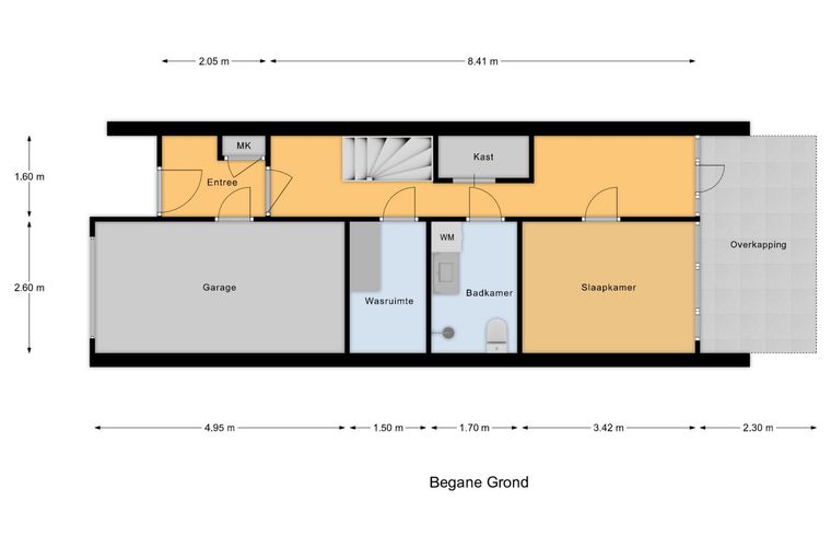 Begane grond: entree; hal met meterkast en toegang tot de garage; garage voorzien van elektra; hal met toegang tot de berging, badkamer en slaapkamer; slaapkamer aan achterzijde; badkamer voorzien van douche, toilet, wastafel en witgoedaansluitingen; vanuit de hal toegang tot de onderhoudsvriendelijke achtertuin;