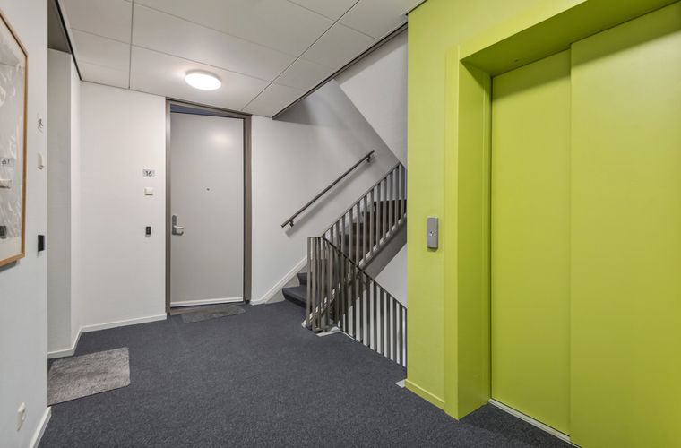 Entree: via een eigen entree met eigen parkeerplaats, bereik je de gezamenlijke hoofdingang met brievenbussen, intercom, trapopgang en lift naar de 1e verdieping.