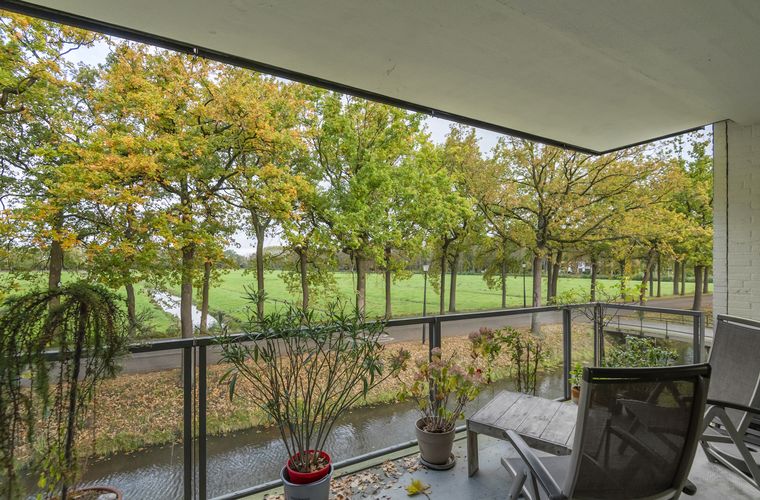 Het balkon biedt, ook als je zit, ruim zicht op bomen en op het historisch landschappelijke groengebied De Volencampen.