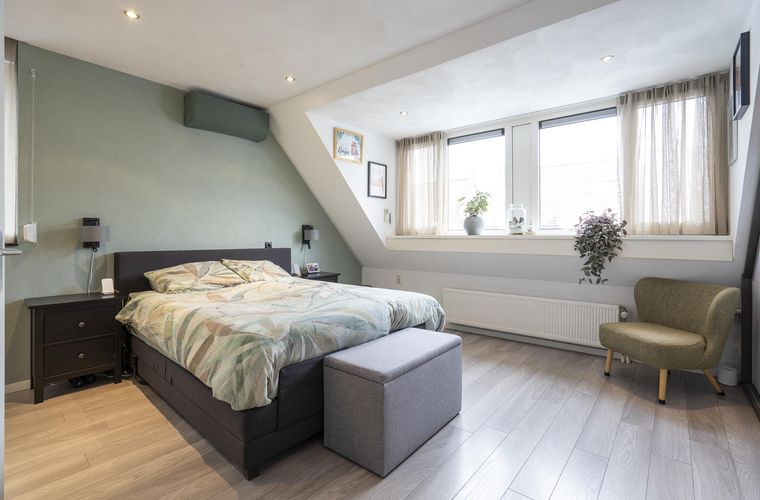 Tweede verdieping: voorzolder met vlizotrap naar extra bergruimte; afgesloten ruimte met witgoedaansluitingen en opstelling cv-installatie; derde slaapkamer met vaste kast en vierde slaapkamer met dakraam en berging achter de knieschotten.