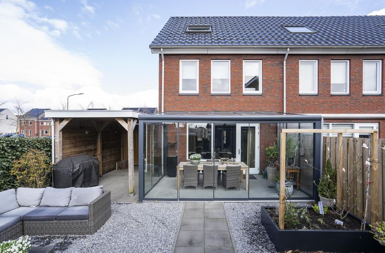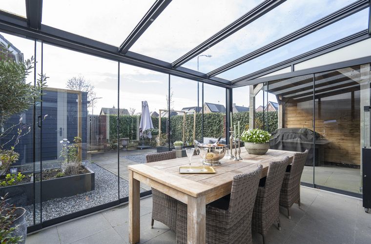- Afsluitbare serre met aluminiumframe en glazen puien zorgt voor extra leefruimte