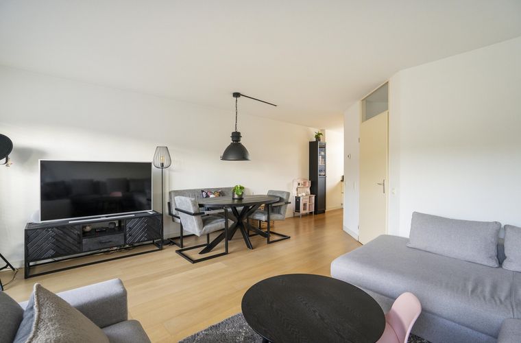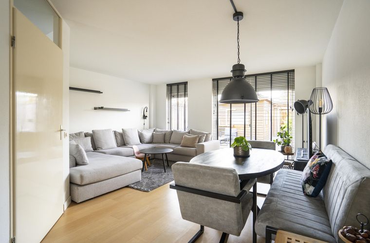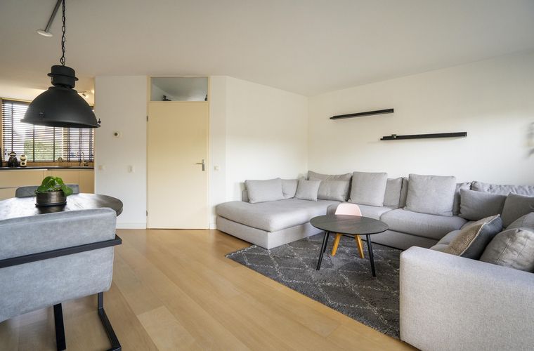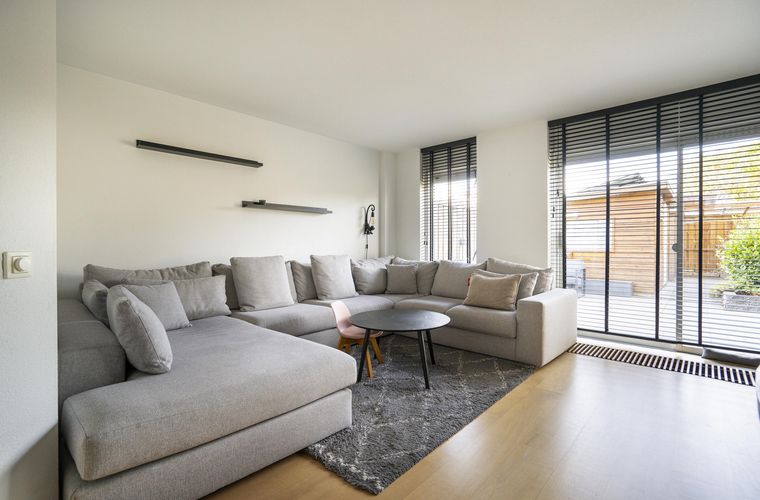 De nette woonkamer is uitgevoerd met een tuingerichte zithoek en biedt middels een grote schuifpui toegang tot de tuin.