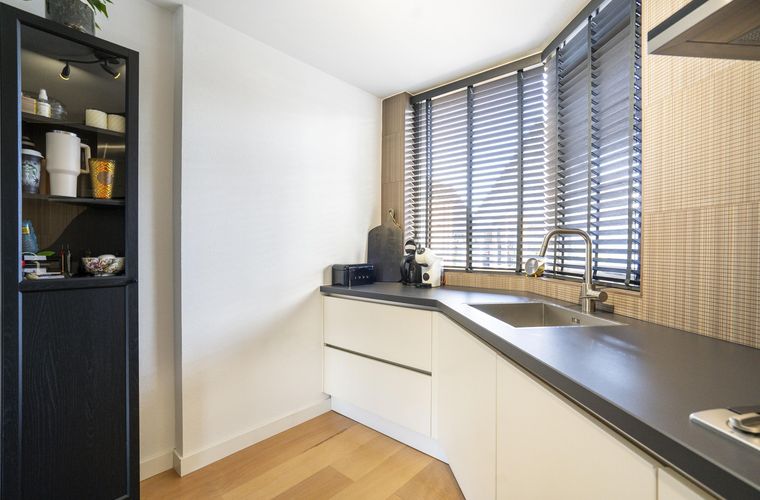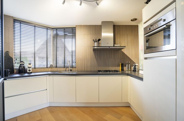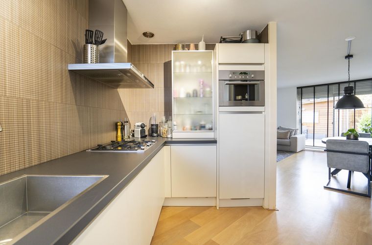 Aan de voorzijde van de woning bevindt zich de open keuken, ingericht met een lichte keukeninrichting, compleet met alle wenselijke inbouwapparatuur, te weten een kookplaat, met afzuigkap, een koelkast, vriezer, combimagnetron en vaatwasser.