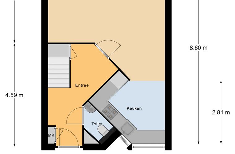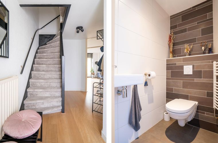 Begane grond: welkom in de nette hal. De hal biedt toegang tot de toilet, de meterkast, de trapopgang naar de verdieping en de woonkamer.