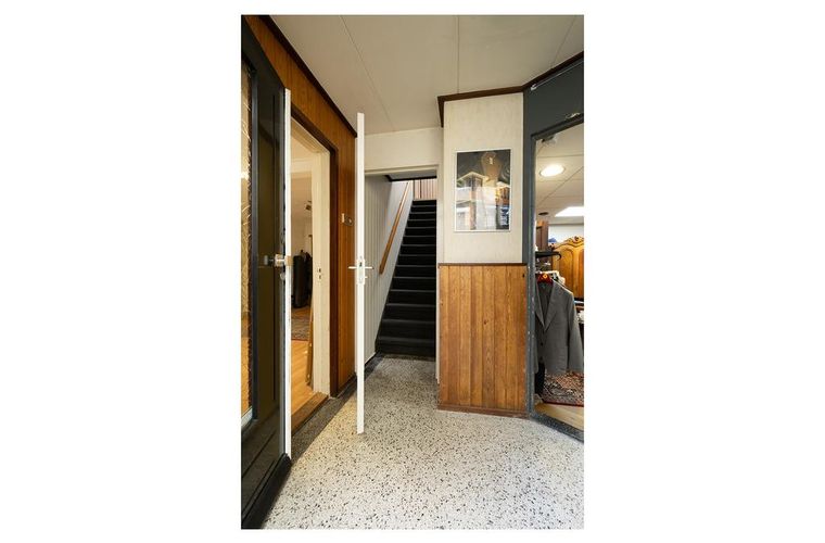Begane grond: entree, hal met toegang tot de berging, winkelruimte en trap naar de eerste verdieping.