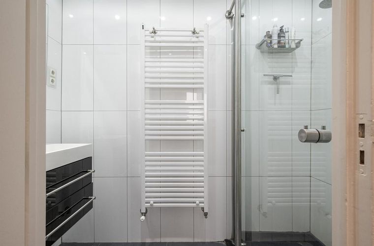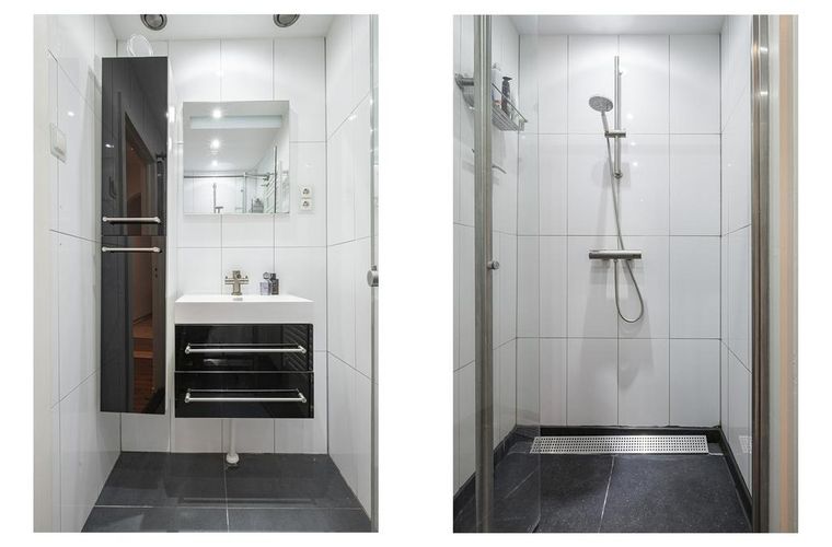 De badkamer is modern afgewerkt met een douche en een wastafel.