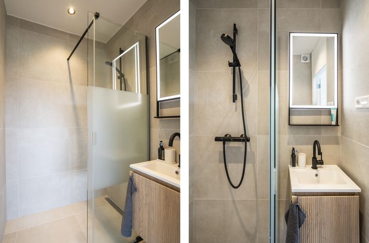 De moderne, volledig betegelde badkamer (2025) is voorzien van een douche, een wastafelmeubel en inbouwspots.
