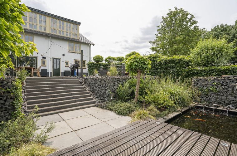 Buiten tref je dezelfde niveauverschillen als binnenshuis, via de vlonder loop je zo over een prachtige vijver naar de overkapping toe, dit is pas een heerlijke plek om in de ondergaande zon de dag door te nemen. Daarnaast tref je ook nog eens een chalet met keuken, een houten berging en een carport die is omgebouwd tot heuse panna-kooi. Parkeren doe je aan de voorzijde en aan de achterzijde, die met auto bereikbaar is.
