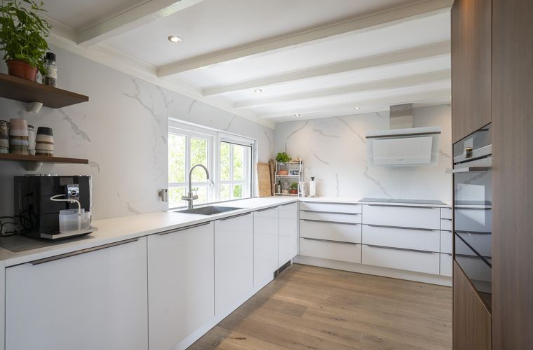 Dijkniveau (huisnummer 137): hal met meterkast; luxe open keuken (2023) met organic glass fronten, Siemens Studio-Line apparatuur (combi-oven, inductiekookplaat, vaatwasser, grote koelkast, grote vriezer) en kokend waterkraan.